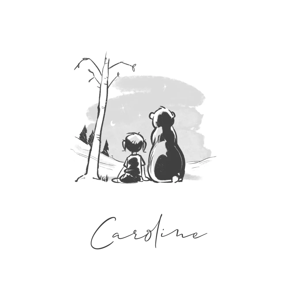 Handgetekend geboortekaartje waarop een meisje samen met een beer naar de sterren in de lucht kijkt.