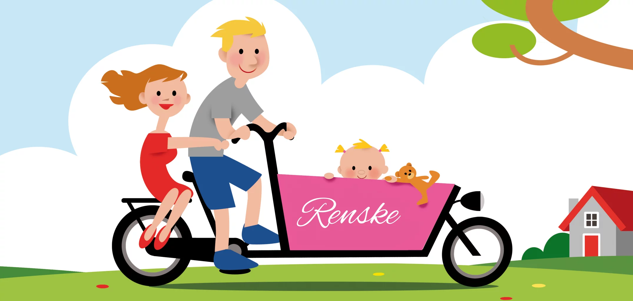 Illustratief geboortekaartje met een gezin dat met een bakfiets door een landschap fietst.