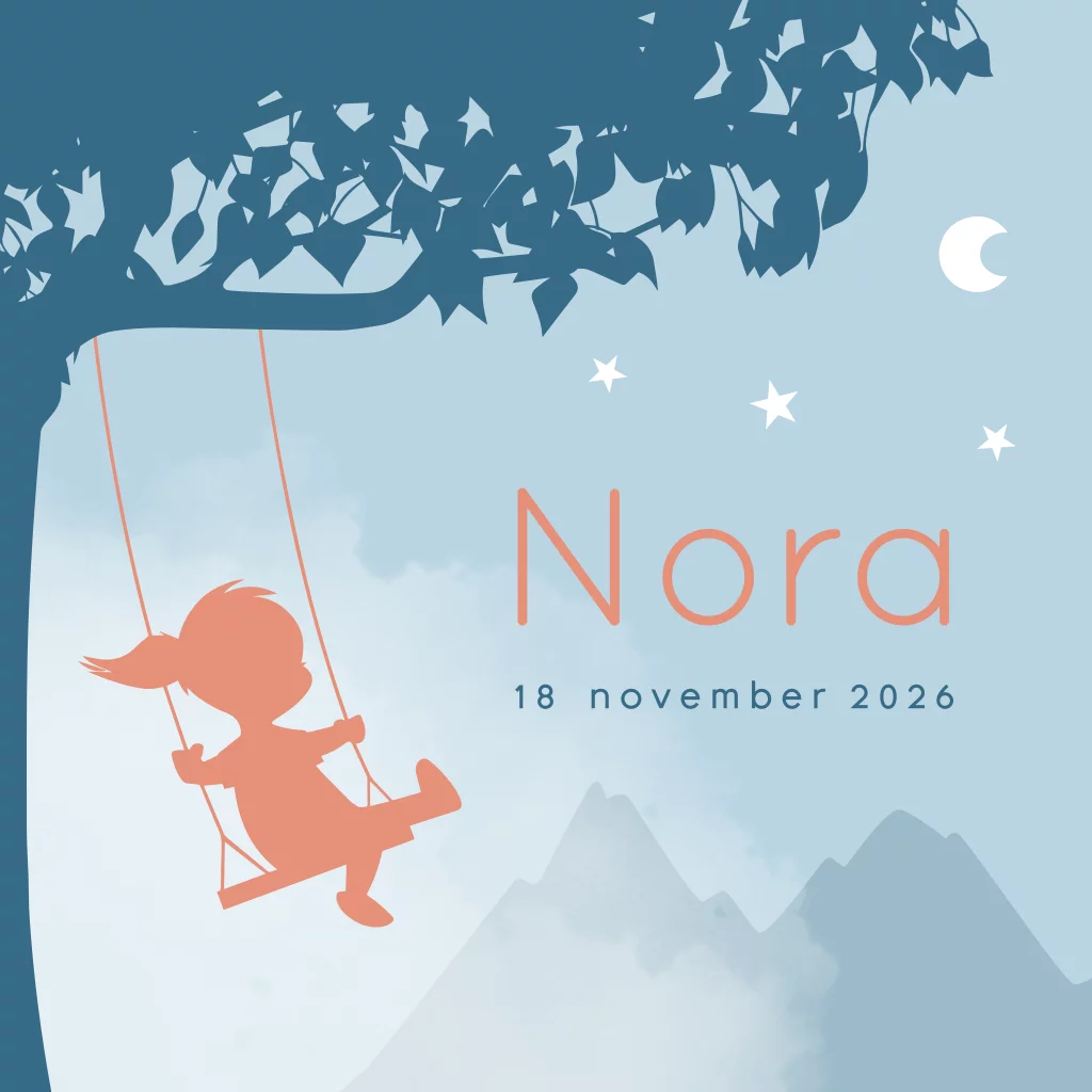 Geboortekaartje met een meisje op een schommel. Verder zie je sterren, bergen, wolken en de maan