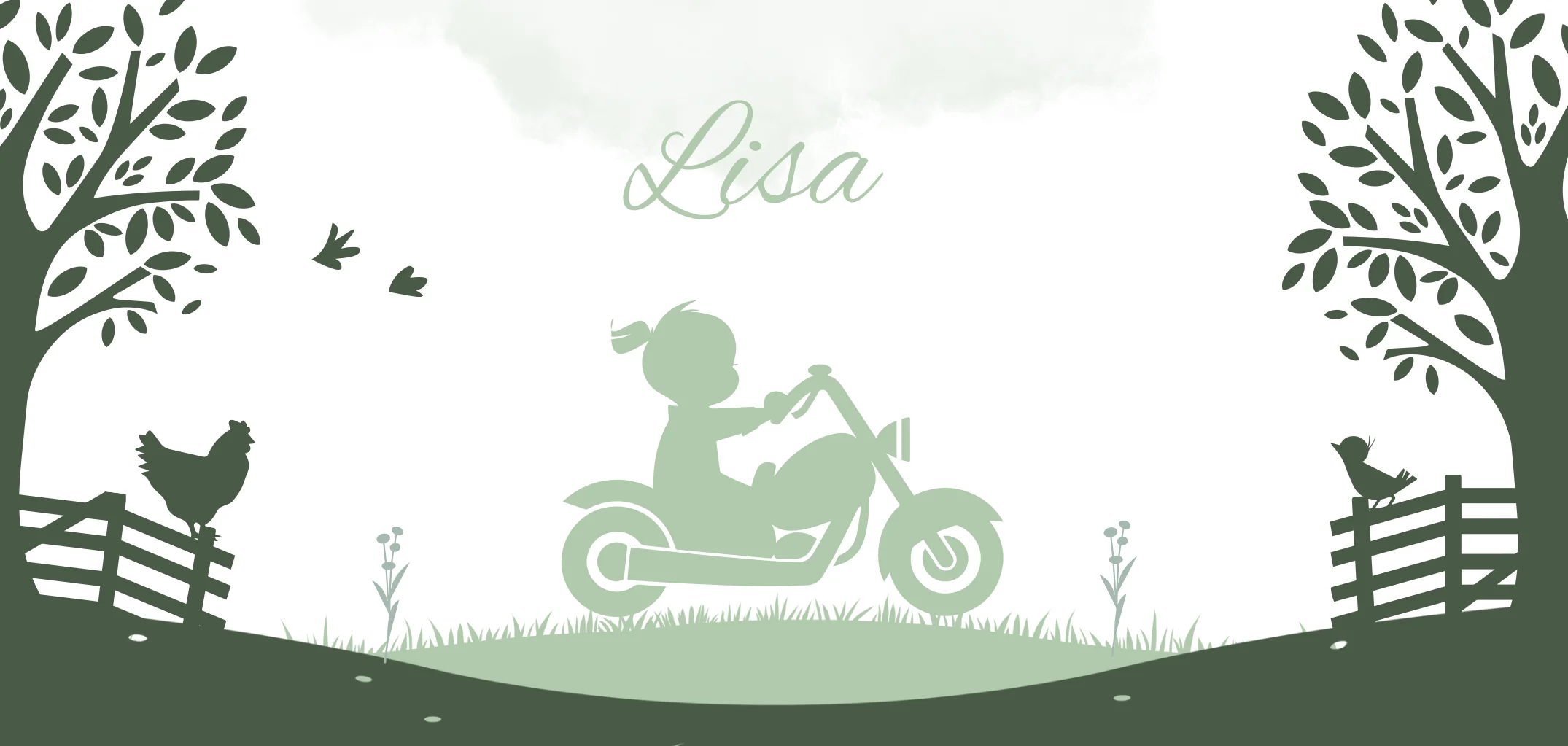 Geboortekaartje in een herfstachtige sfeer. Een stoer meisje zit op een motor en rijdt dooe een groen landschap. Ook beschikbaar voor een jongetje!