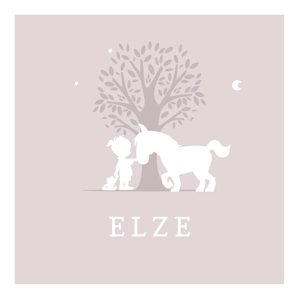Geboortekaartje met in silhouet een meisje en een paard in stemmig zwartfolie.