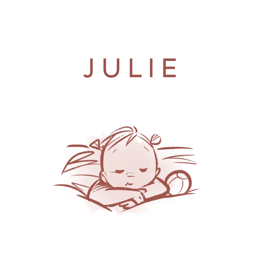 Geboortekaartje, in een robuuste lijn getekend, met een meisje dat ligt te slapen in de kussens.