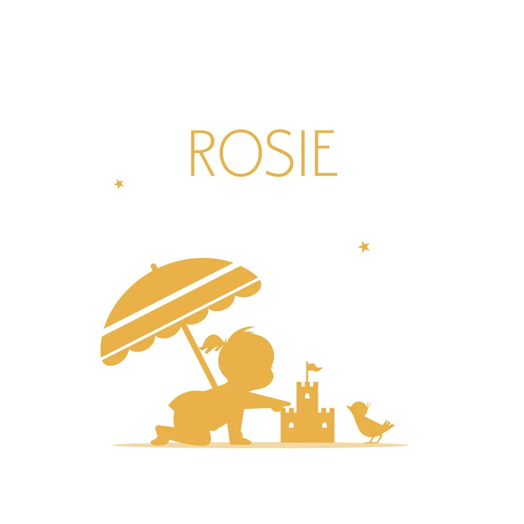 Zomers geboortekaartje met een meisje dat in het zand onder een parasol zit te spelen met een zandkasteel. Een klein vogeltje kijkt toe.
