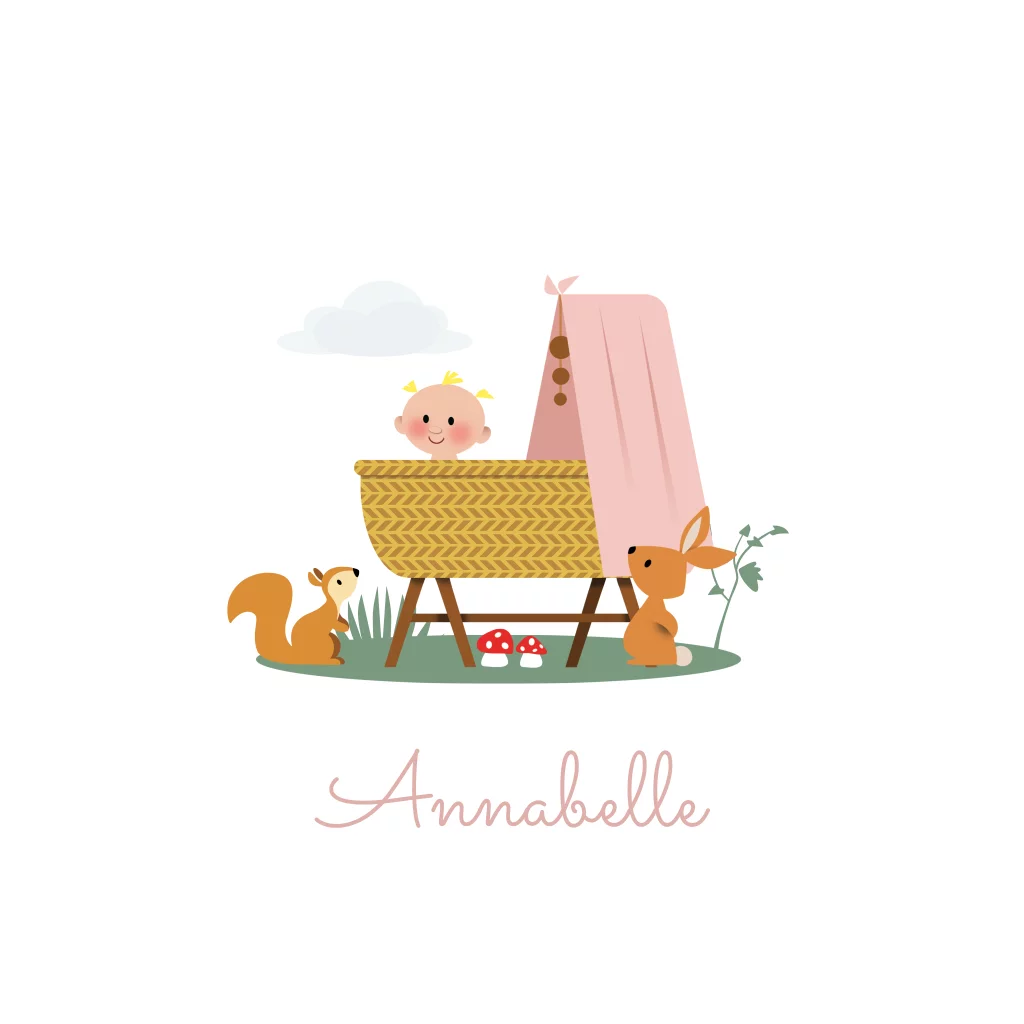Geboortekaartje meisje in wieg konijn eekhoorn wolk gras