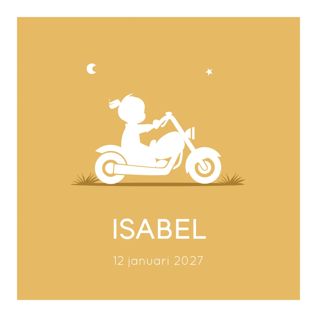 Stoer geboortekaartje waarop je een meisje op een motor ziet zitten. Als je liever een jongetje wilt kun je dit kaartje aanpassen door naar de beeldbank te gaan en een ander silhouetje te kiezen.