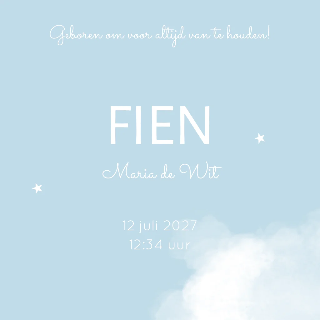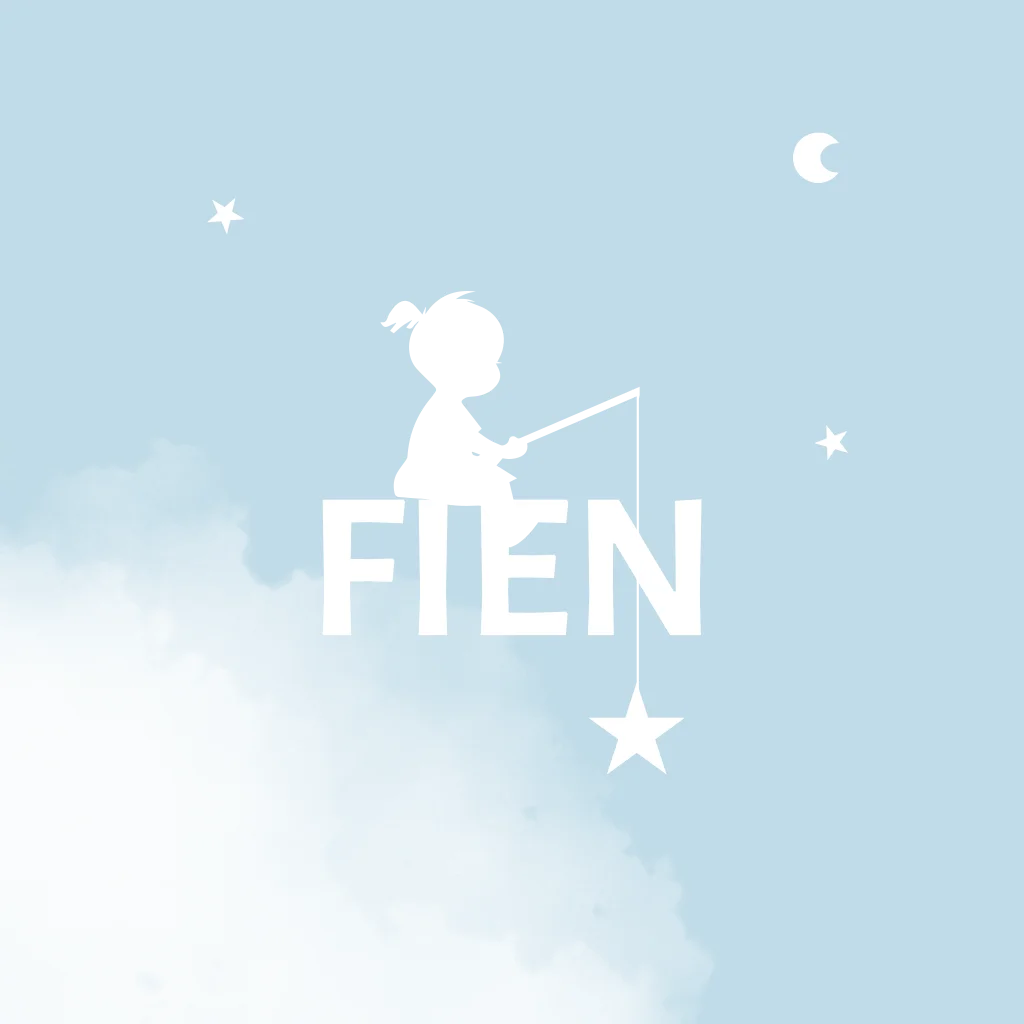 Geboortekaartje waarop je een meisje ziet dat in de wolken aan het hengelen is naar een ster. Ze zit op haar eigen naam. Het silhouetje is in zwartfolie. Van het meisje is makkelijk zelf een jongetje te maken. Kijk in de beeldbank voor alle silhouetjes.