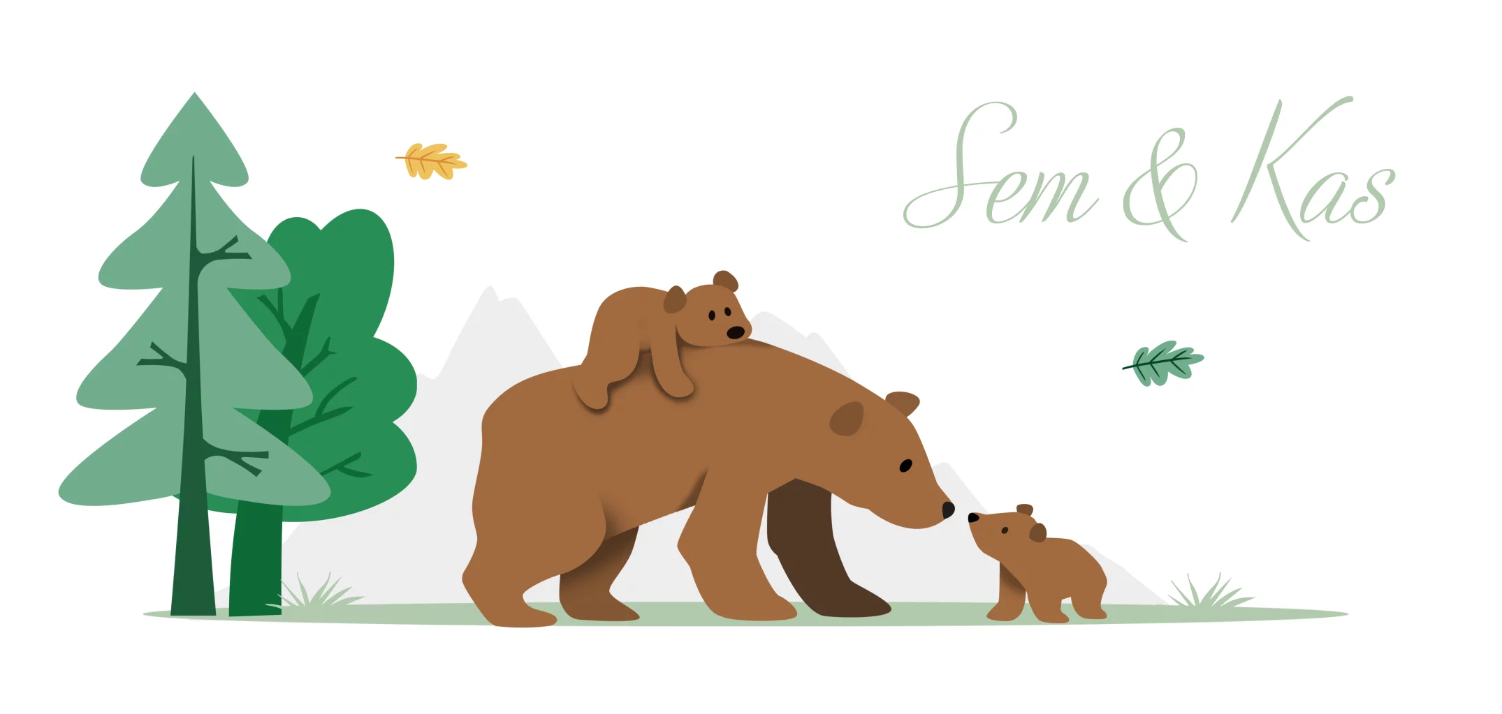 Dubbel landscape geboortekaartje met drie beren, bomen, heuvel en blaadjes.