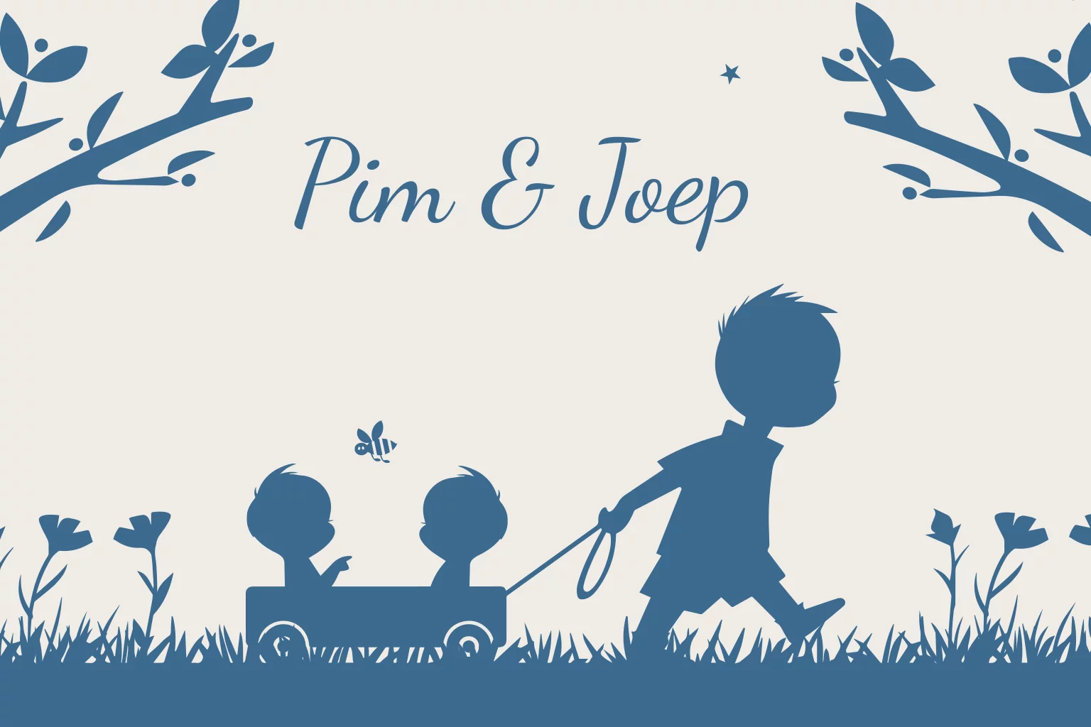 Geboortekaartje waarop een grote broer zijn twee kleine tweelingbroertjes voorttrekt in een bolderkar door het gras. Je kunt van de jongetjes zelf meisjes maken. Hulp nodig? Bel of mail even, we helpen graag!