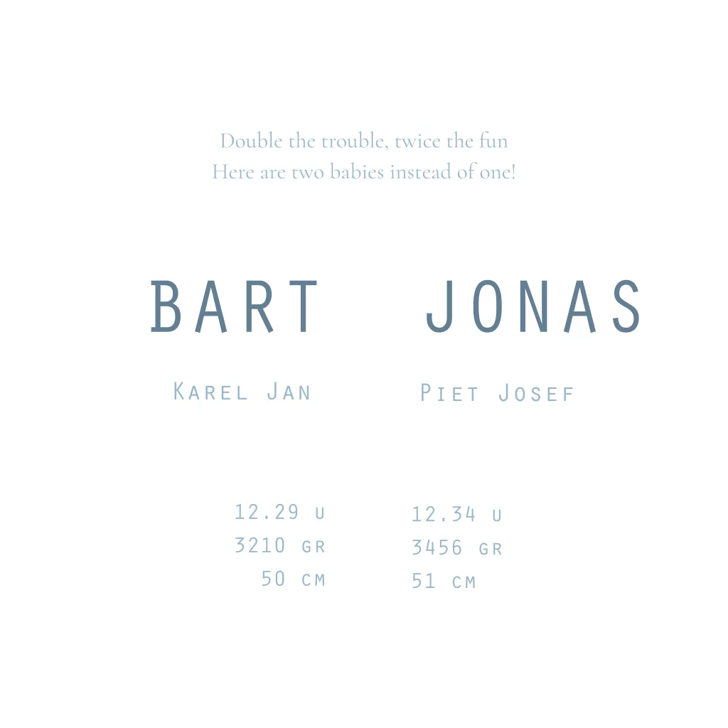 Vierkant geboortekaartje voor een tweeling.