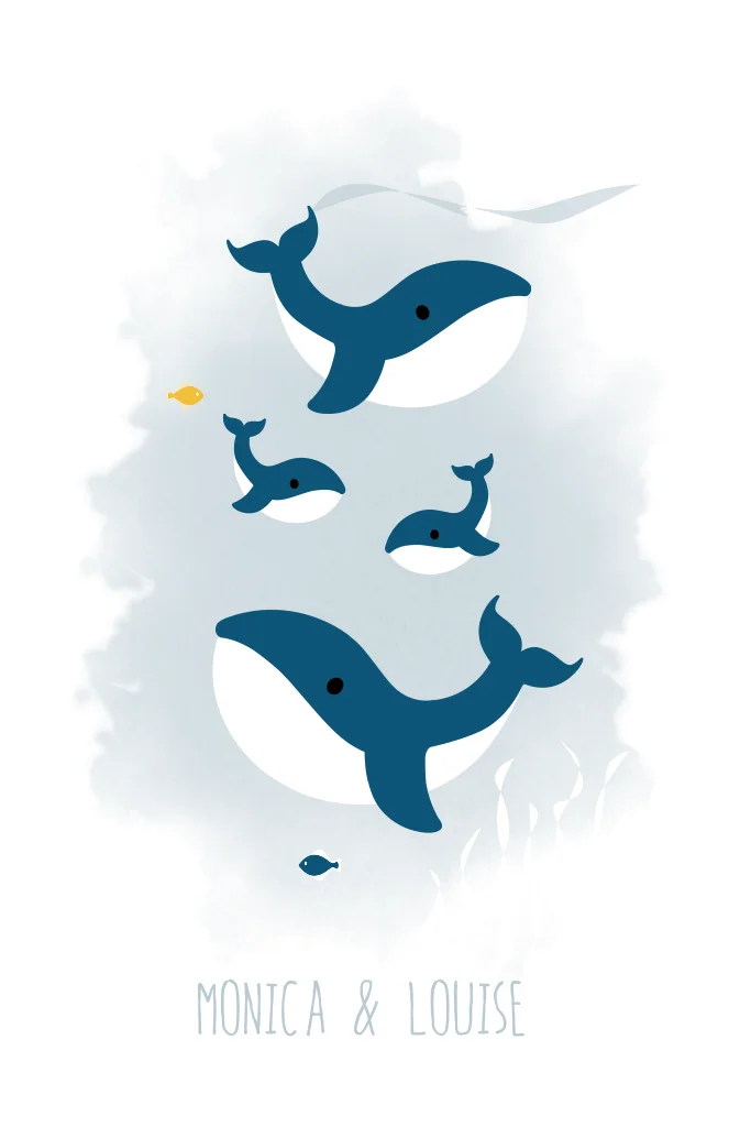 Geboortekaartje met een walvissengezin. Twee grote walvissen en twee kleinere walvissen zwemmen in de zee.