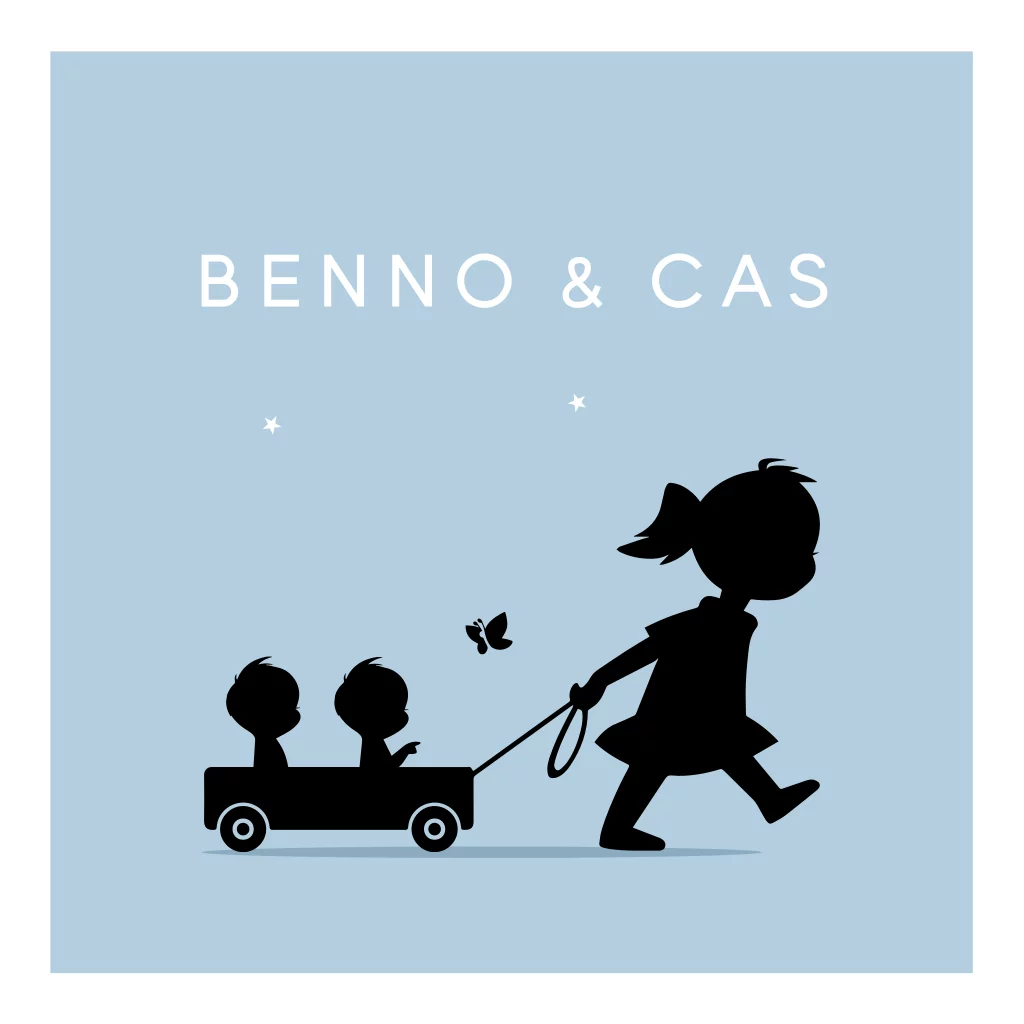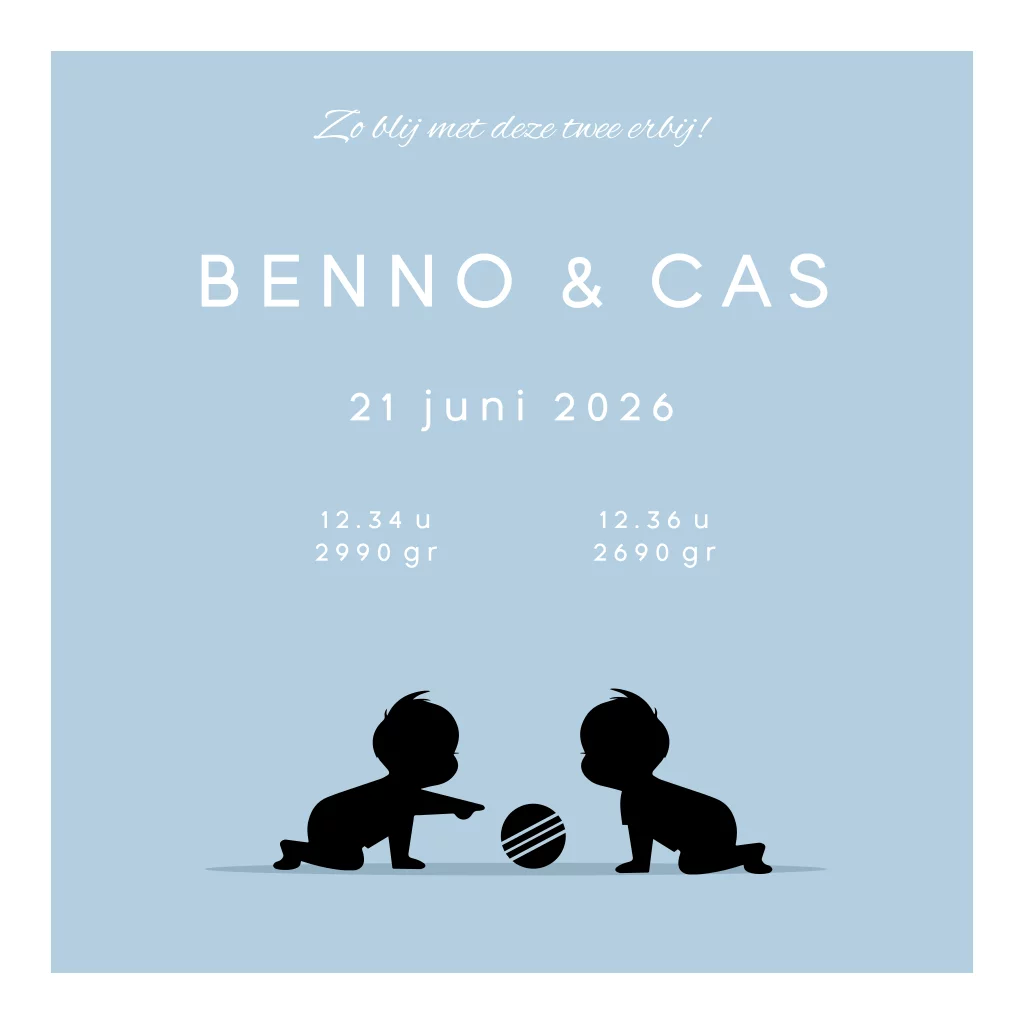 Geboortekaartje waarop een meisje een jongenstweeling in een bolderkar voorttrekt. Van de jongens kun je ook meisjes maken.
