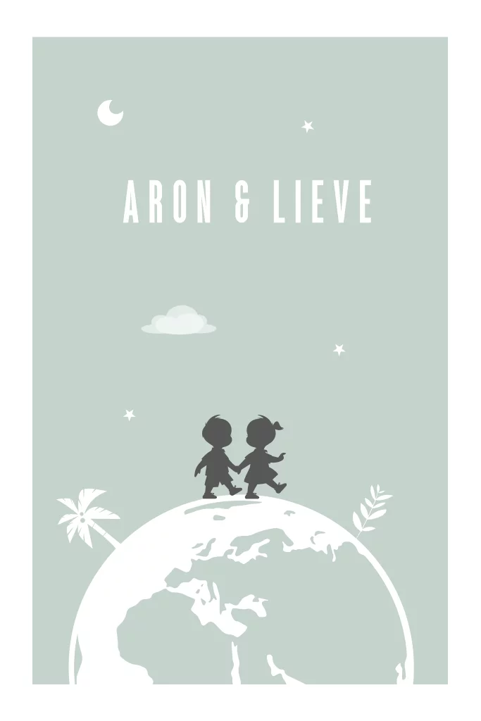 Geboortekaartje waarop twee kinderen over de wereldbol lopen.
