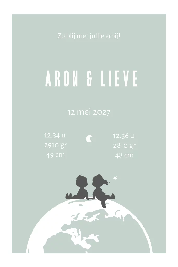 Geboortekaartje tweeling wereldbol groen wolken ster maan