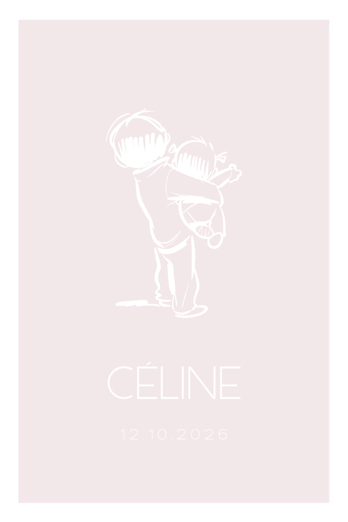 Geboortekaartje in lijntekening waarop een grote broer zijn kleine zusje draagt. Delijnen zijn in zwartfolie