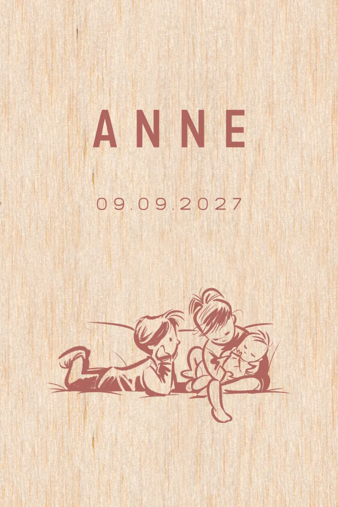 Geboortekaartje op hout met afgeronde hoeken. Illustratie met drie kinderen op de bank