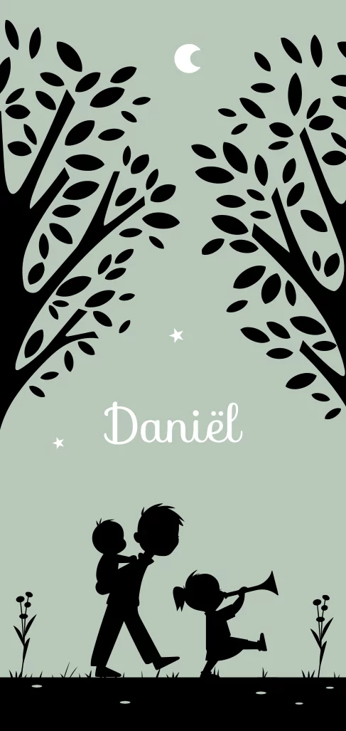 Geboortekaartje drie kinderen silhouet trompet bomen