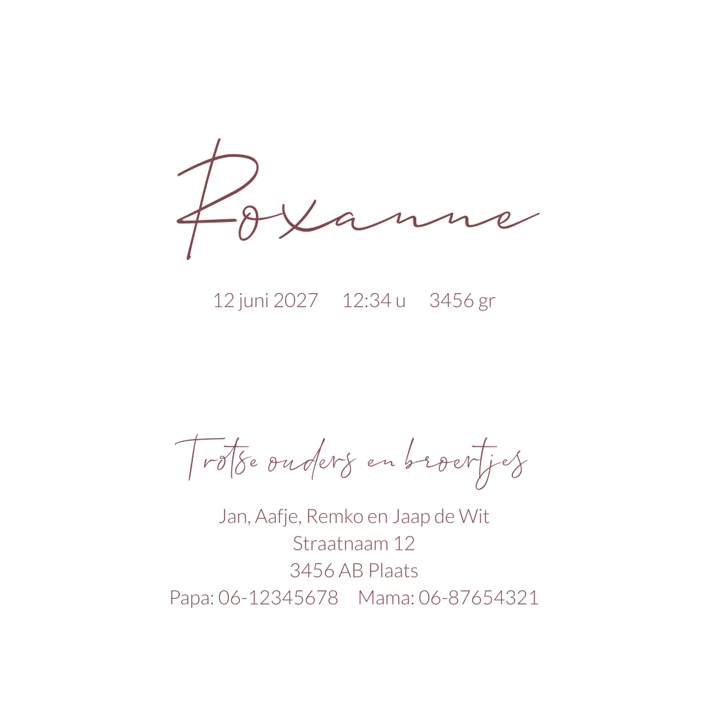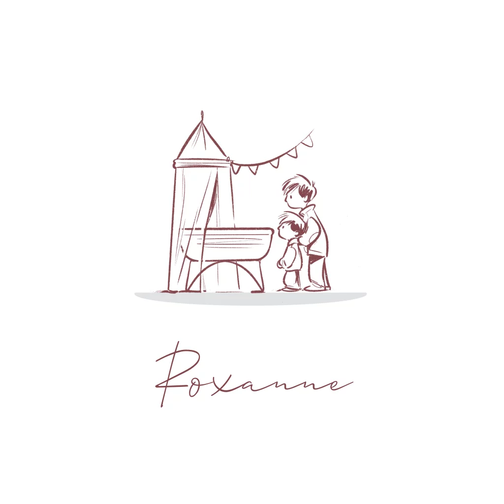 Dubbel geboortekaartje met afgeronde hoeken waarop je twee jongetjes ziet die in de wieg kijken waarin hun pasgeboren broertje of zusje ligt. Heel makkelijk te customizen naar je eigen gezinssamenstelling.