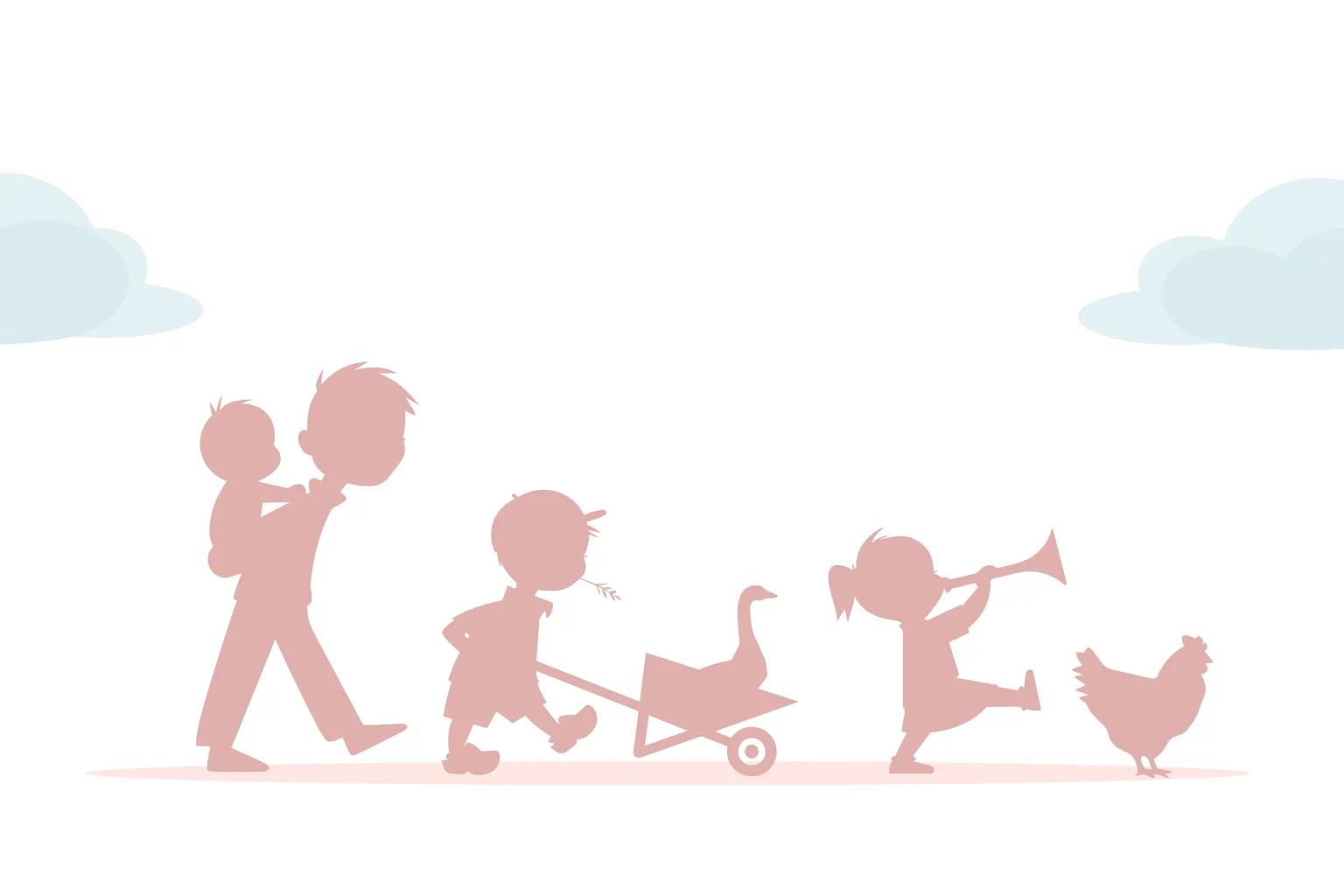 Luxe geboortekaartje voor een vierde kindje. Vier kinderen lopen in een optocht, vergezeld van een kip en een gans. Aan de binnenkant van het kaartje zie je een meisje op een paard zitten. Door de dieren krijgt het kaartje een vrolijke boerderij-uitstraling. De voornaam en de sterren zijn in zilverfolie gedrukt.