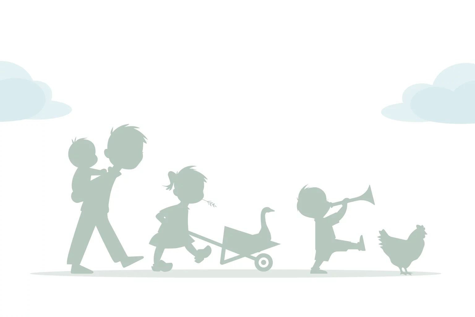 Luxe geboortekaartje voor een vierde kindje. Vier kinderen vormen een optocht waarbij de voorste op een trompet blaast en de tweede een gans in een kruiwagen voortduwt. Dit kaartje heeft een boerderijthema. De voornaam en de sterren zijn in goudfolie gedrukt.