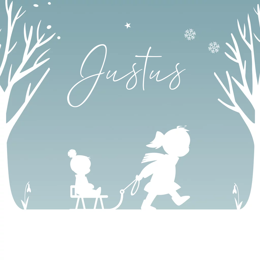 Winters geboortekaartje met goudfolie elementen. Een meisje trekt haar kleine broertje op een slee mee over het ijs. Je ziet sneeuwvlokken, krokussen en een sneeuwpop.