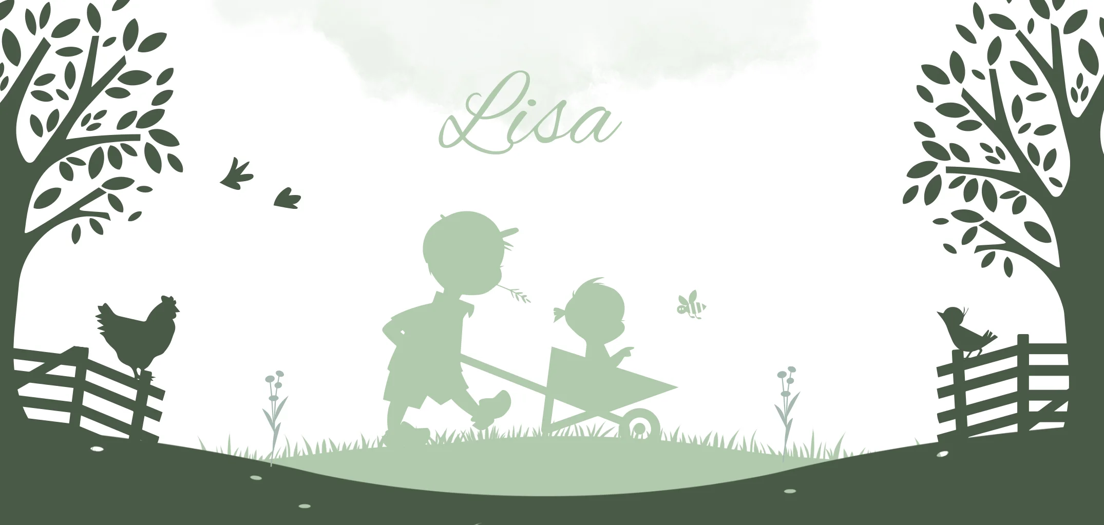Geboortekaartje in een herfstachtige sfeer. Een jongetje met pet en klompen duwt zijn zusje in een kruiwagen voort. Met boerderij, paard, ganzen, kip en bladeren.