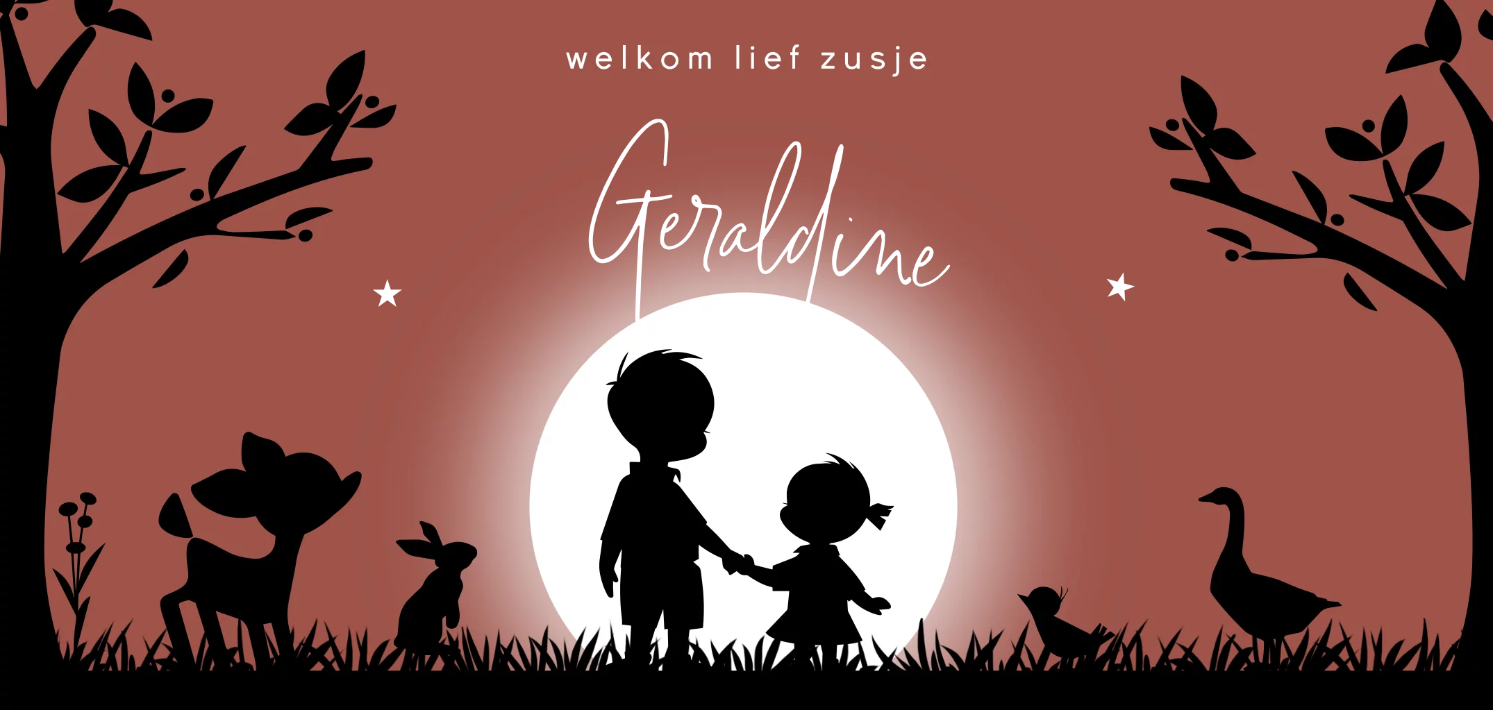 Geboortekaartje broer en zus voor ondergaande zon hert konijn gans