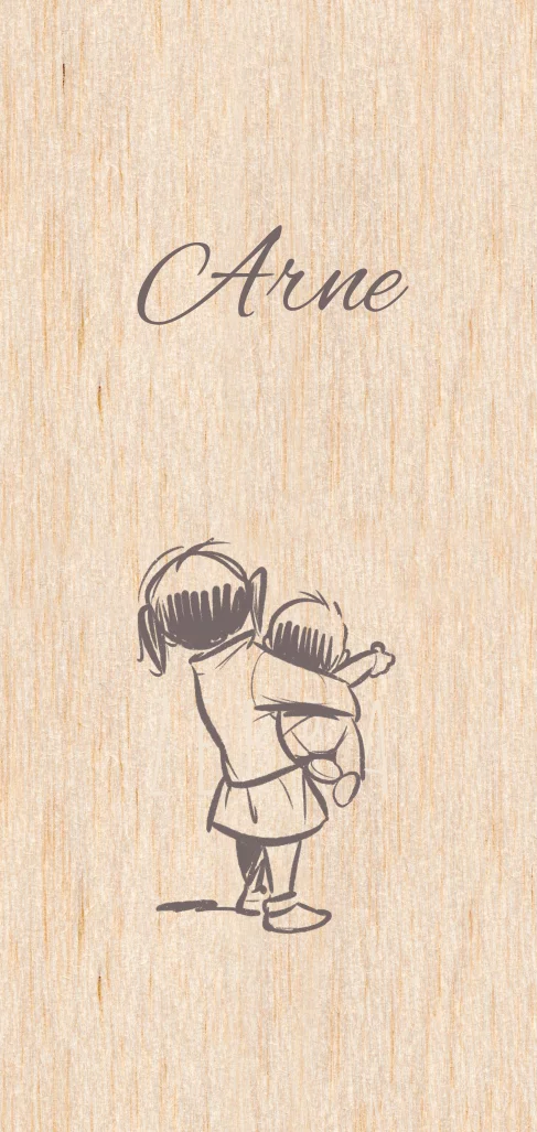 Geboortekaartje op echt hout met een tekening van een meisje dat haar kleine broertje stevig vasthoudt.