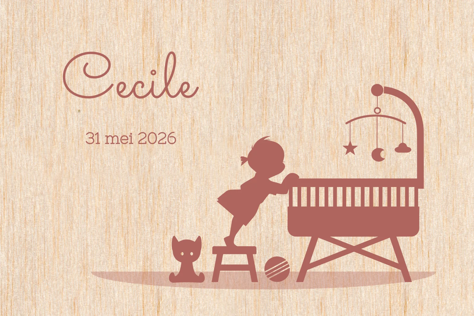 Geboortekaartje waarop een meisje over de rand van de wieg naar haar pasgeboren zusje kijkt.