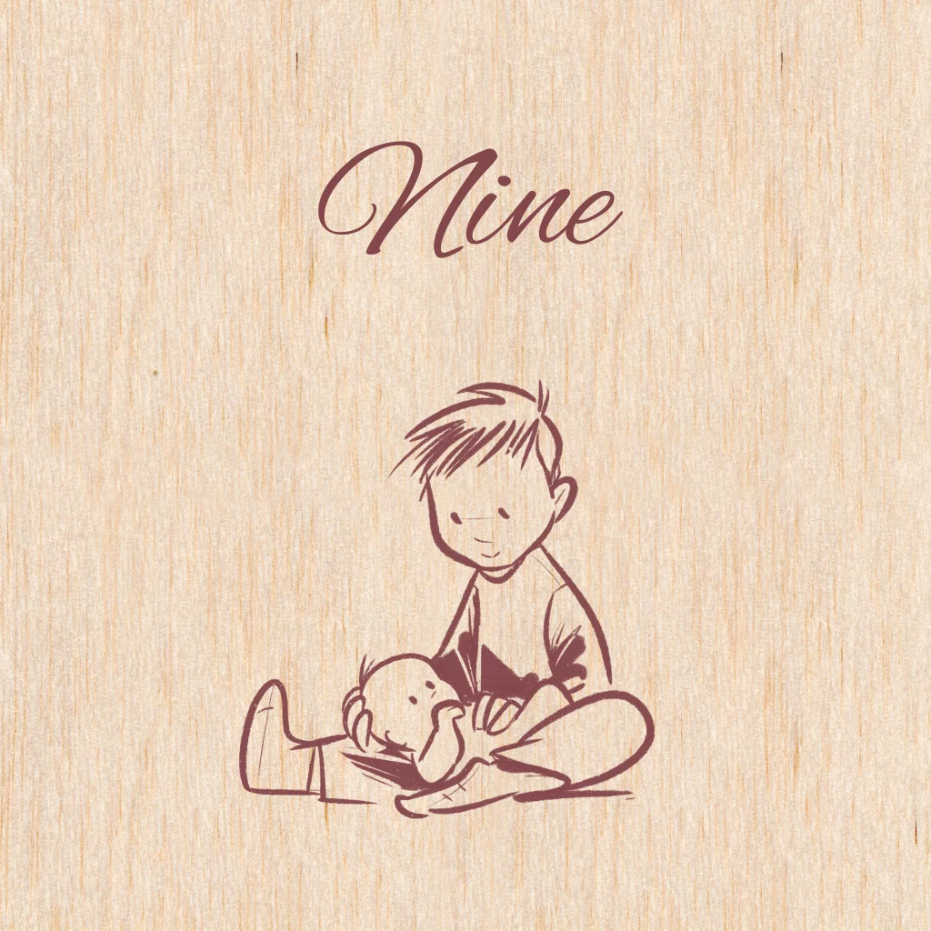 Op dit houten geboortekaartje zie je een lijntekening met een jongen die een baby op schoot heeft.