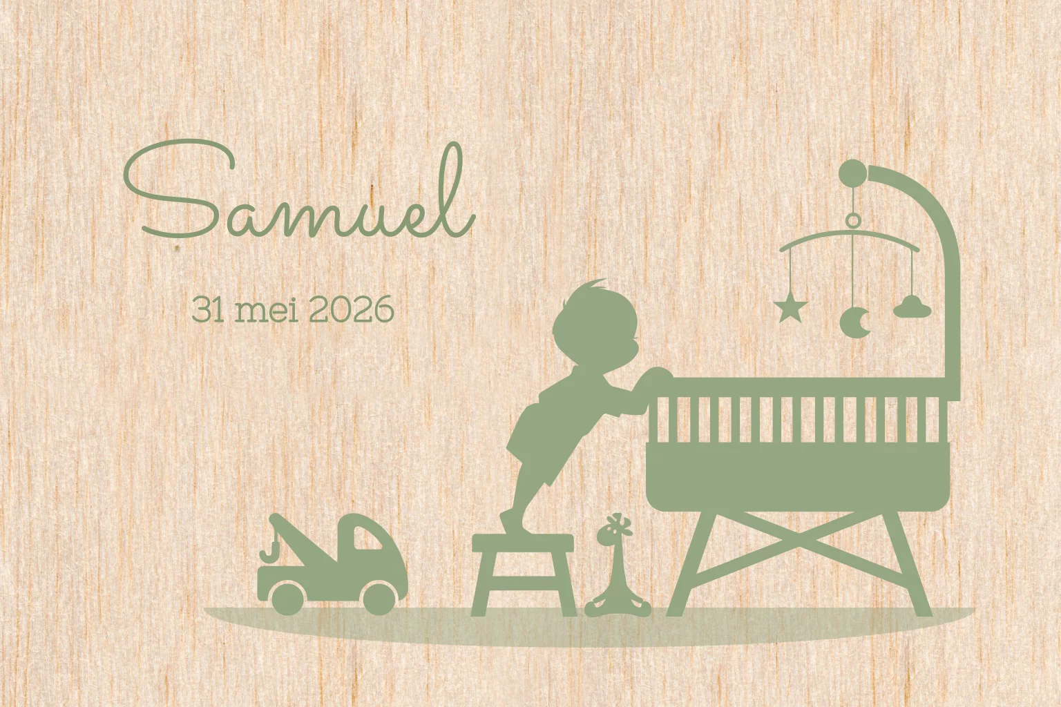 Houten geboortekaartje jongen bij wieg