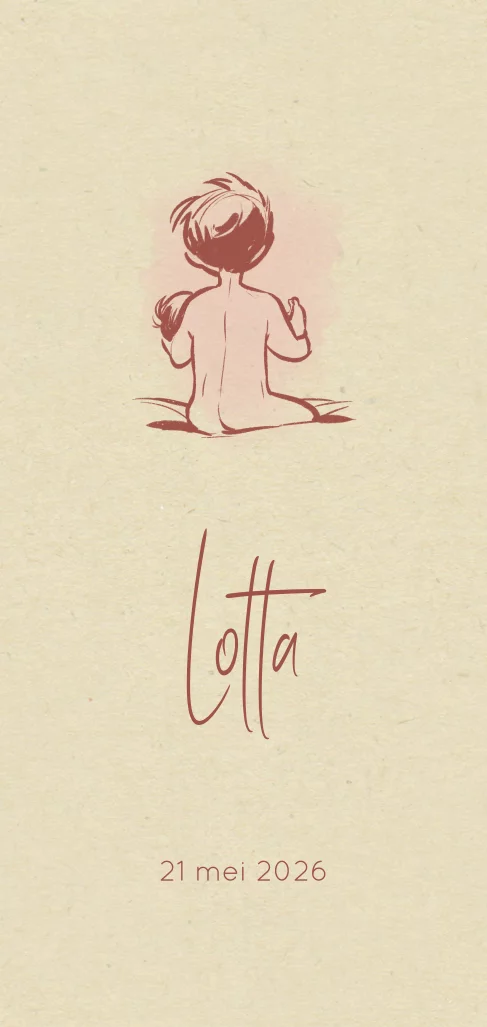 Geboortekaartje waarop een jongetje dat, van de rug af gezien, een baby vasthoudt.