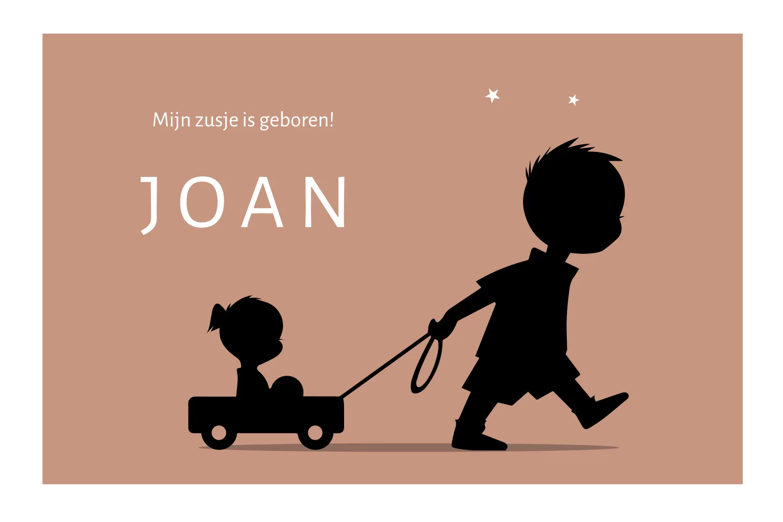 Modern silhouet geboortekaartje met een jongen dat zijn kleine zusje meeneemt in een bolderkar. De kleuren zijn zwart en bruin met een wit kader.