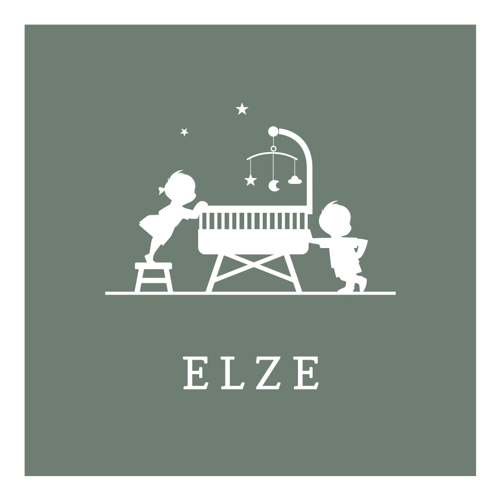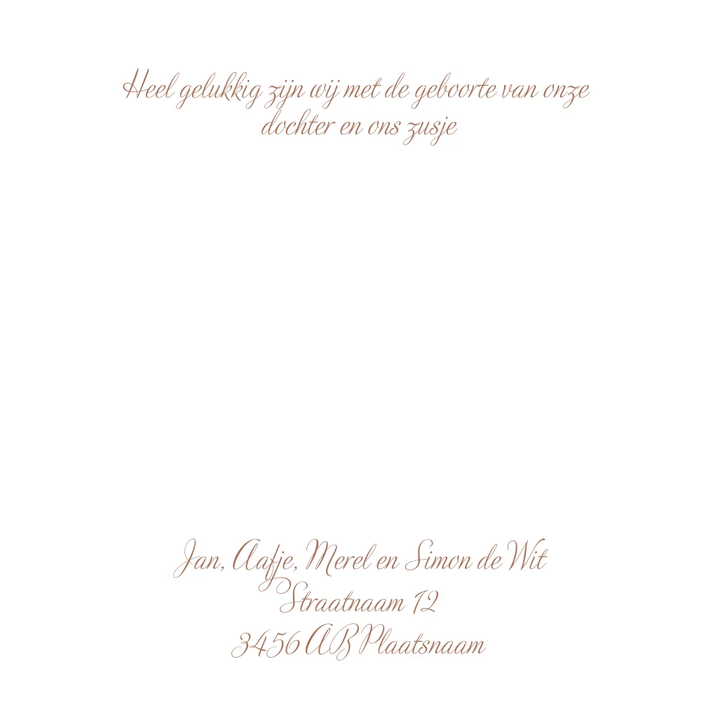 Geboortekaartje met in goudfolie het silhouet van twee kinderen bij de wieg van hun pasgeboren zusje.