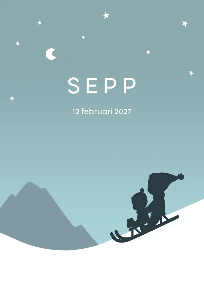Geboortekaartje waarop je het silhouet ziet van twee jongetjes die met een slee van een helling afroetsen. Stoer en sportief kaartje voor een tweede kindje!