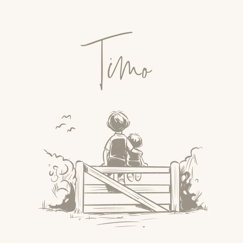 Geboortekaartje, in een robuuste lijn getekend, met twee broertjes die samen op een hek zitten