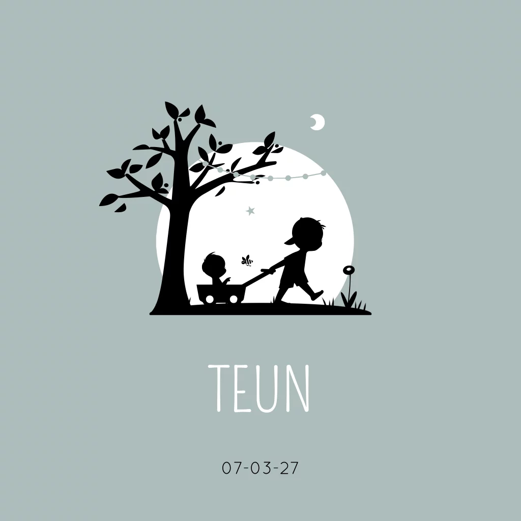Sfeervol geboortekaartje waarop een grote broer zijn kleine broertje in een bolderkar voorttrekt.
