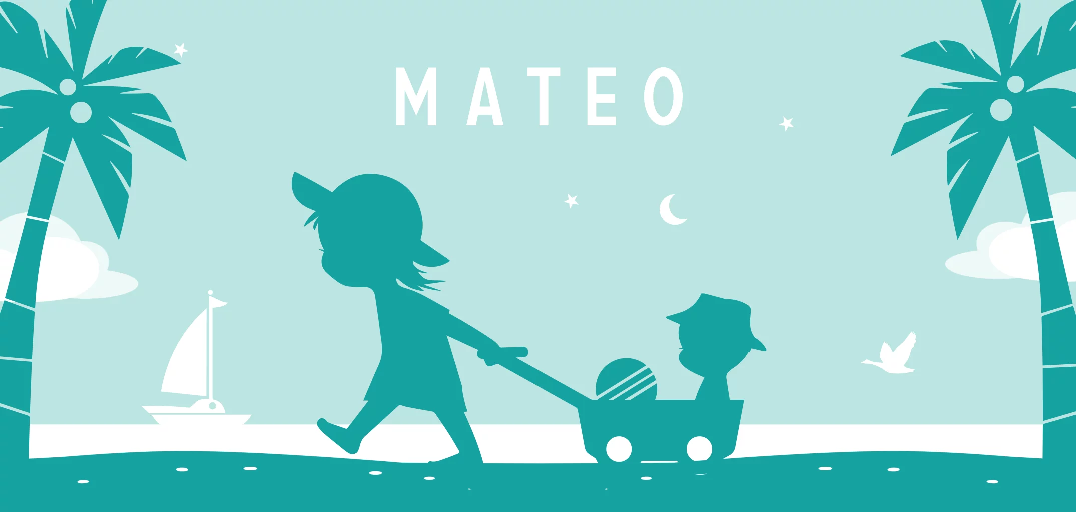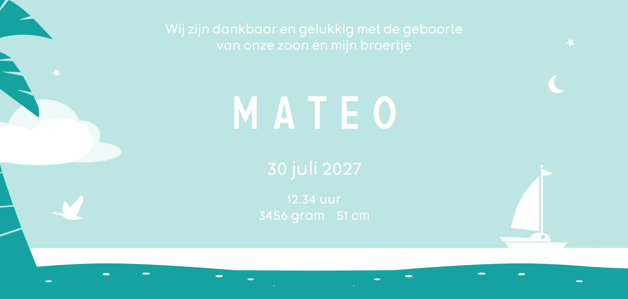 Geboortekaartje in een tropische setting. Een meisje met zomerhoed trekt haar babybroertjein een bolderkar over een strand. De palmbomen en zeilboot geven het kaartje een extra zomerse sfeer!