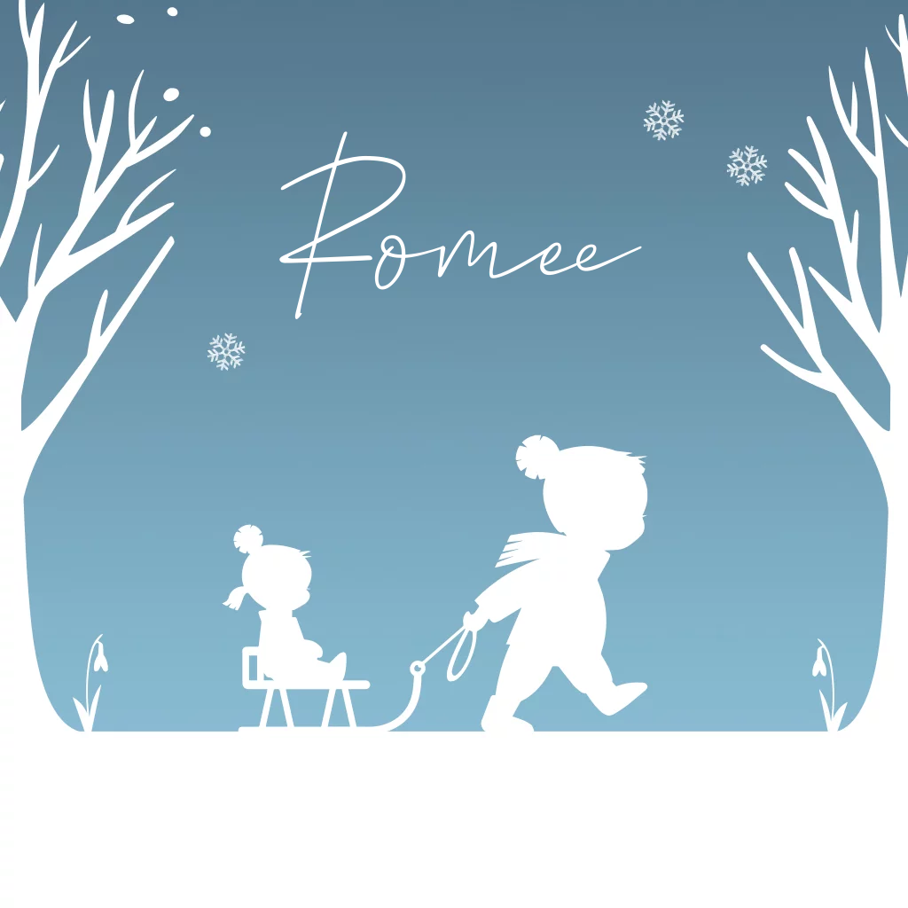 Winters geboortekaartje met een grote broer die zijn zusje voorttrekt op de slee. De naam en sterren zijn in goudfolie gedrukt. LET OP: folie kaartjes hebben een langere levertijd. Voor 6 uur besteld is de dag erna gedrukt en verzonden.