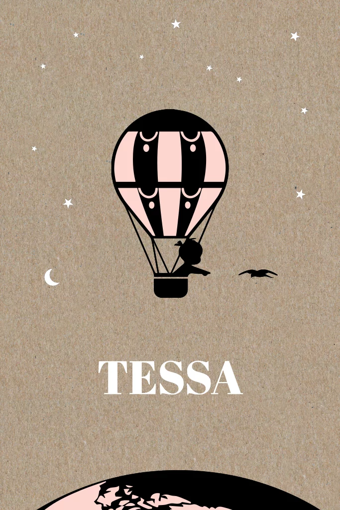 Op dit geboortekaartje met een kraft achtergrond wijst een meisje in een luchtballon naar een vogeltej in de lucht. Van het meisje kan je zelf een jongetje maken. Kijk in onze beeldbank!